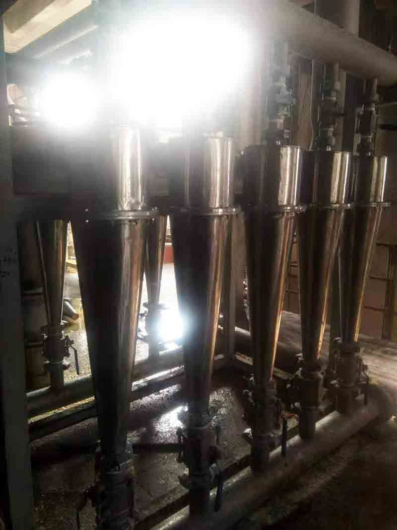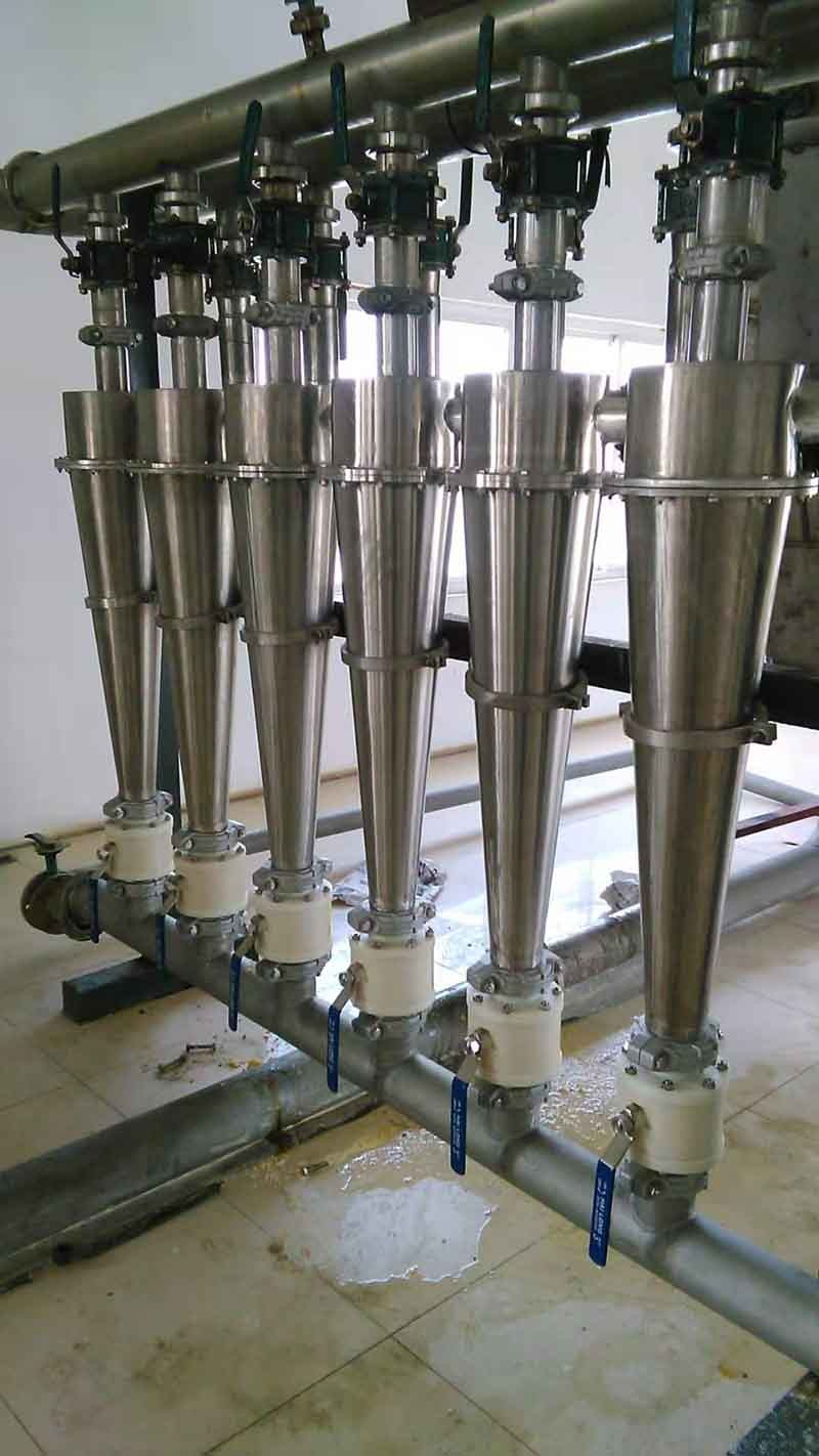 作為離心力與重力復合力場的典型設備,因其結構簡單、占地面積小、安裝操作方便、運行成本低等優點而被廣泛地用于諸多領域。旋流器的基本原理是將具有一定密度差的液-液、液-固、液-氣等兩相或多相混合物在離心力的作用下進行分離。將混合液以一定的壓力切向進入旋流器,在圓柱腔內產生高速旋轉流場?;旌衔镏忻芏却蟮慕M分在旋流場的作用下同時沿軸向向下運動,沿徑向向外運動,在到達錐體段沿器壁向下運動,并由底流口排出,這樣就形成了外旋渦流場;密度小的組分向軸線方向運動,并在軸線形成一向上運動的內渦旋,然后由溢流口排出,這樣就達到了兩相分離的目的。